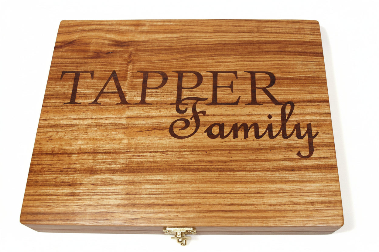 This heirloom-quality game box showcases Africa Beli wood enhanced by Peruvian walnut inlay, designed to house one box of professional dominoes, two Bicycle playing card sets, and six dice, ALL of which are also included. Each piece is personalized with your family name engraved into the wood—longer names may require adjusted font sizing. Wood species can be customized to match your preferences, making this both a functional gaming storage solution and a distinguished display piece for discerning collectors.